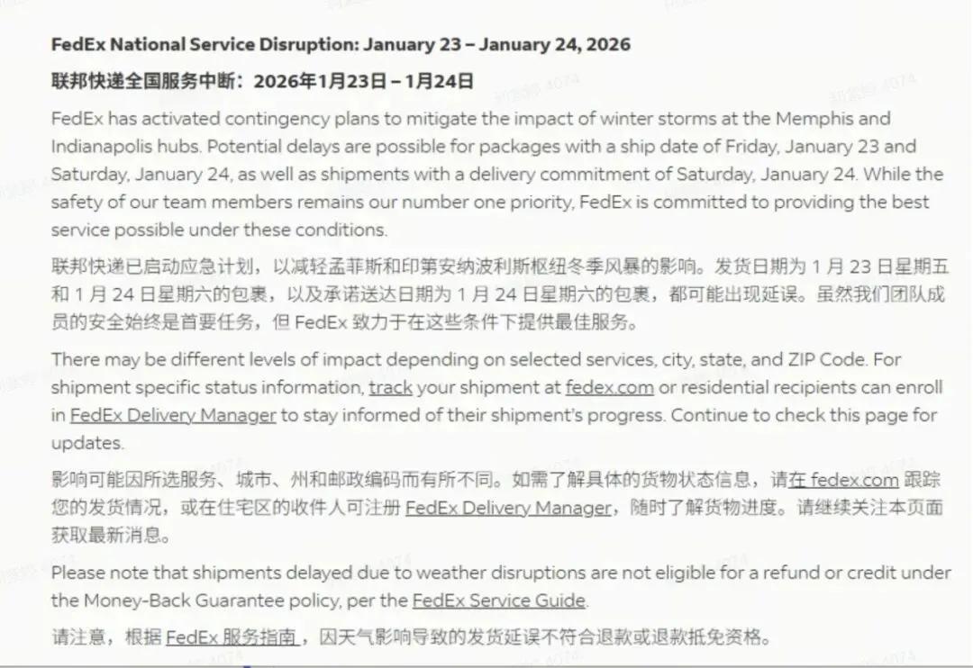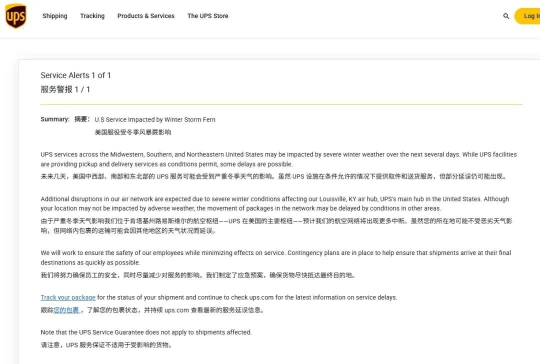 面对极端天气,美国邮政(USPS)、FedEx、UPS等物流公司纷纷发布物流延误预警。美国邮政于当地时间1月21日发布服务警报,将西南部、南部平原、中西部、俄亥俄河谷和东南部大片区域纳入受影响范围,表示冬季天气可能影响这些地区邮件和包裹的处理、运输和递送。联邦快递同步启动应急预案,减轻冬季风暴对孟菲斯和印第安纳波利斯枢纽的冲击,官方提示发货日期为1月23日(周五)和1月24日(周六)的包裹,以及承诺于1月24日(周六)送达的货物,大概率会出现延误,建议密切关注物流动态。UPS已制定应急预案,关闭了路易斯维尔的全球最大航空货运枢纽,暂停相关货运业务,将在安全条件允许时立即恢复服务,并尽快运送客户的关键货物。