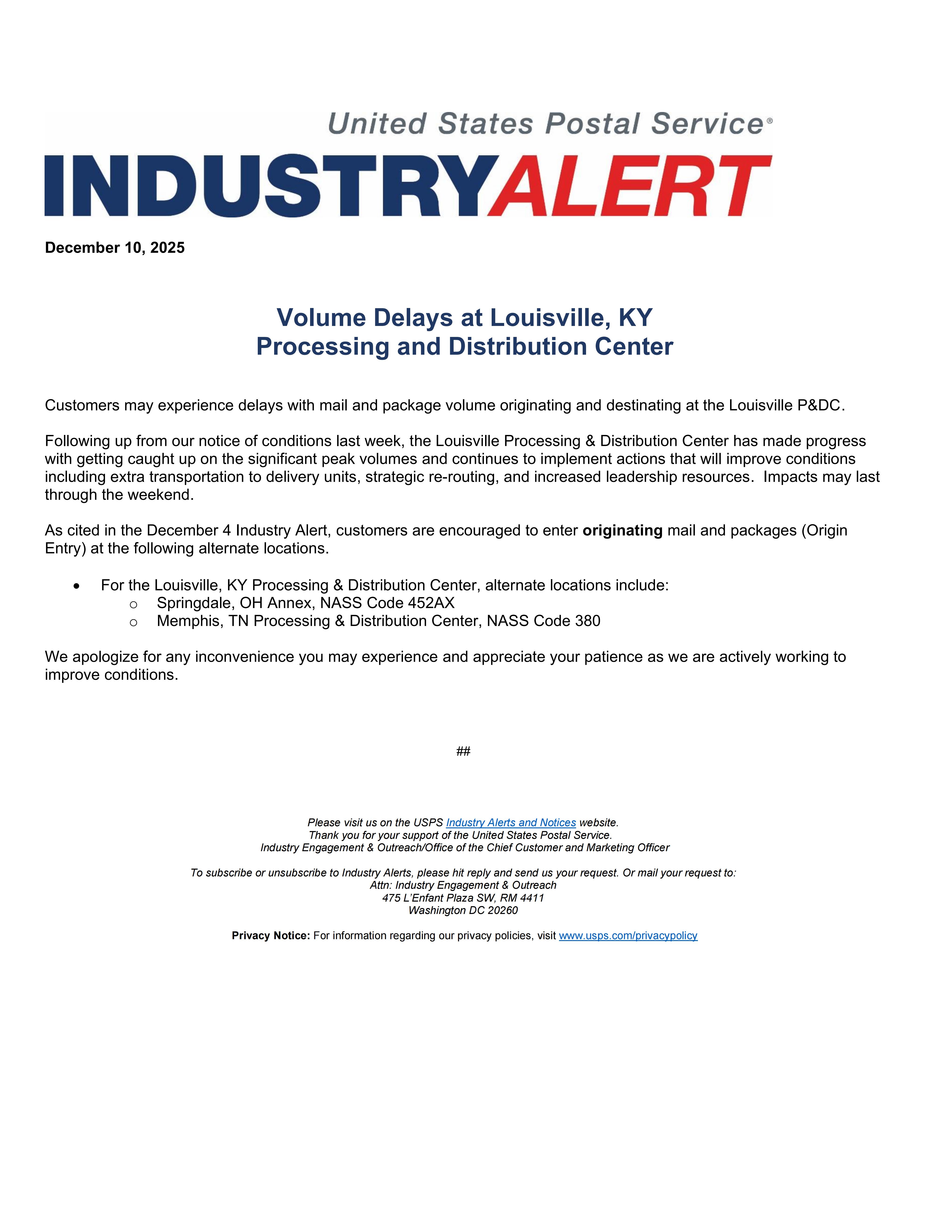接收到USPS官网最新消息,目前在美国中西部地区,特别是经由伊利诺伊州(如South Suburban, IL)、印第安纳州、俄亥俄州、肯塔基州(如Louisville, KY)及田纳西州等地的包裹处理与运输出现显著延误。受影响的设施包括上述地区的包裹处理中心及目的地派送站点。